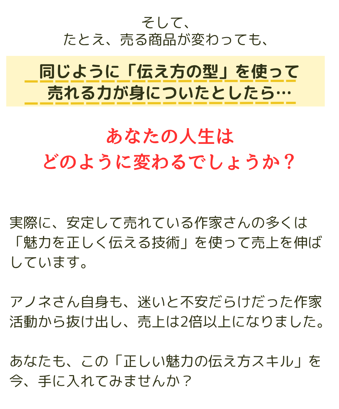 それを間近で見てきた人が書いたモノだからこそ、この教材には、誰にでも再現できるヒントがちゃんとあります。 「売れる作家に変わる力」は、誰の中にもあります。