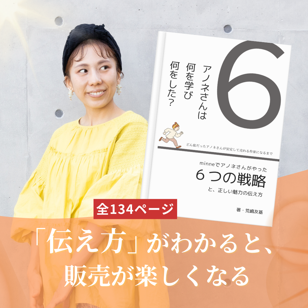 これは、アノネさん自身が「minneで売れなかった時代から、売れる作家に変わるまで」に実践してきた、リアルな経験・試行錯誤・成果の出た方法を、余すことなく詰め込んだ教材です。